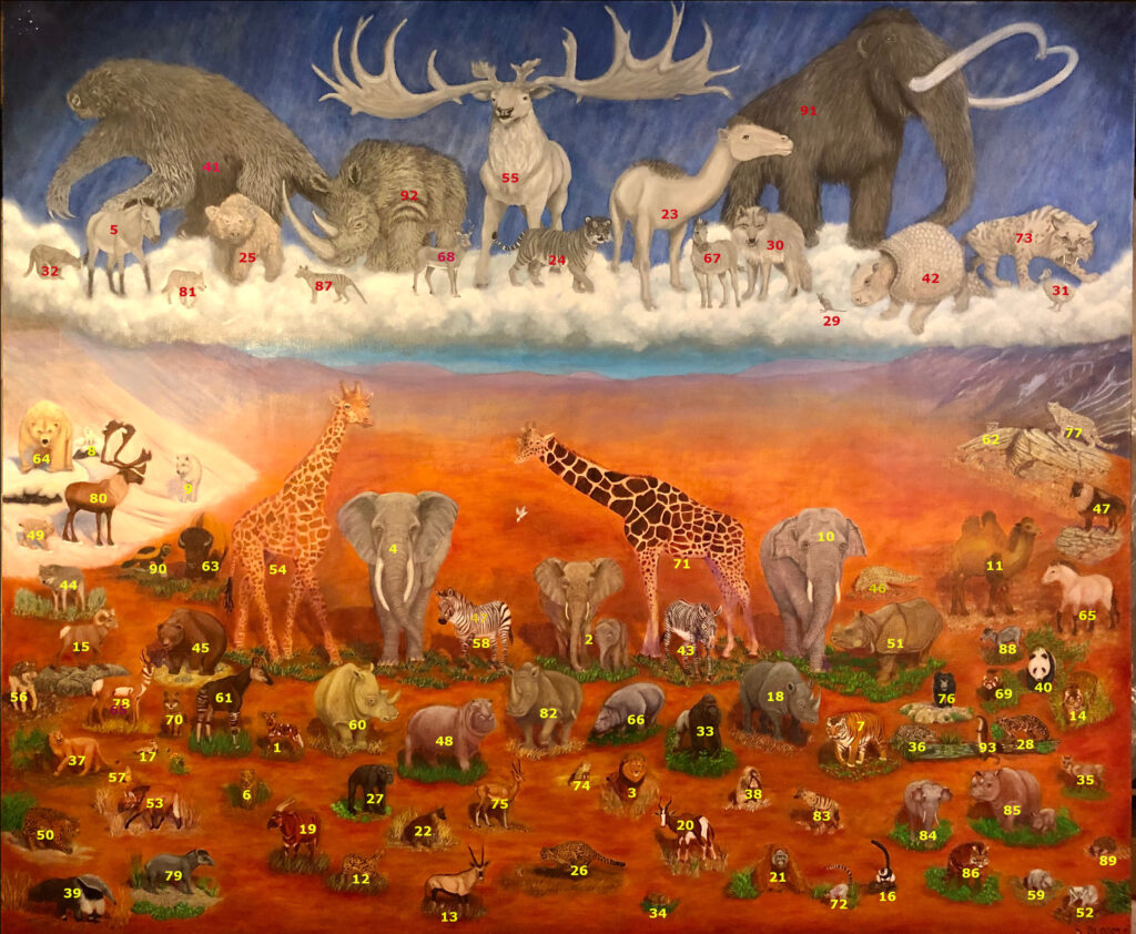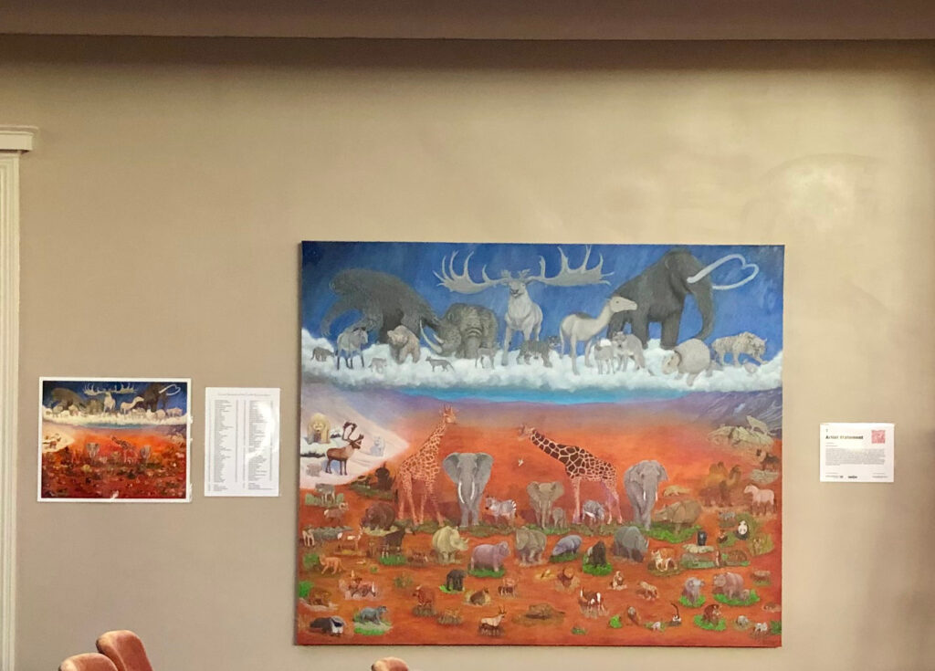 My artwork for ArtPrize is entitled, “Good Stewards of the Earth“. It is a 6′ x 5′ oil on canvas of endangered and extinct animals. The exctinct megafauna and recently extinct animals are portrayed as ghosts in the clouds. I hope it will inspire people to take action on climate change, poaching, illegal animal and animal parts trade. Creating this painting helped me work through my grief from losing my son to Muscular Dystrophy last year. This painting was done in his honor.