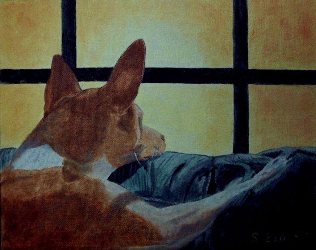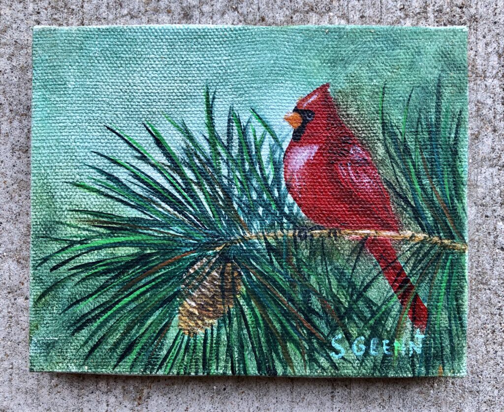 Cardinal in Pine, oil on canvas, 5 x 4″
