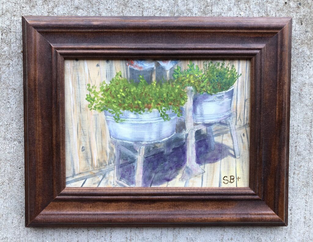 Herbs in Washtubs, oil on hardboard, 7 x 5″